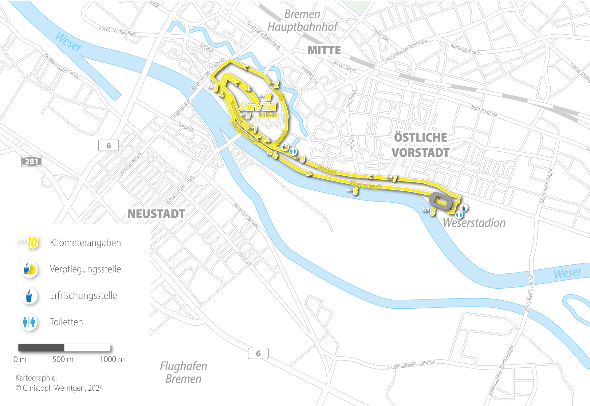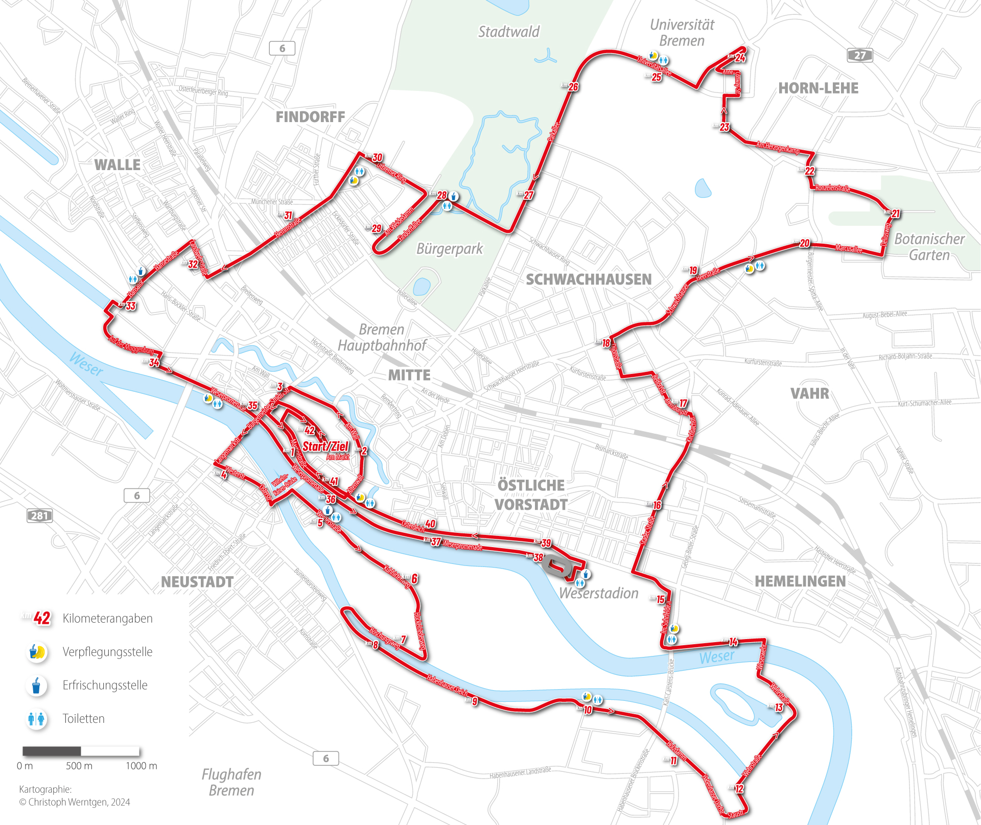 Der Start- und Zielbereich befindet sich – wie gewohnt – im Herzen Bremens auf dem Marktplatz. Die Strecke führt Dich an zahlreichen markanten Orten der Stadt vorbei und zeigt Bremen von seiner schönsten Seite. Ob die Innenstadt mit Rathaus, Roland und den Stadtmusikanten, der Werdersee, der Botanische Garten, die Universität, das Universum, der Bürgerpark, die Überseestadt, die Schlachte, der Osterdeich oder das Weserstadion – du erlebst Bremen hautnah, mit begeisterten Zuschauerinnen und Zuschauern entlang der gesamten Strecke.