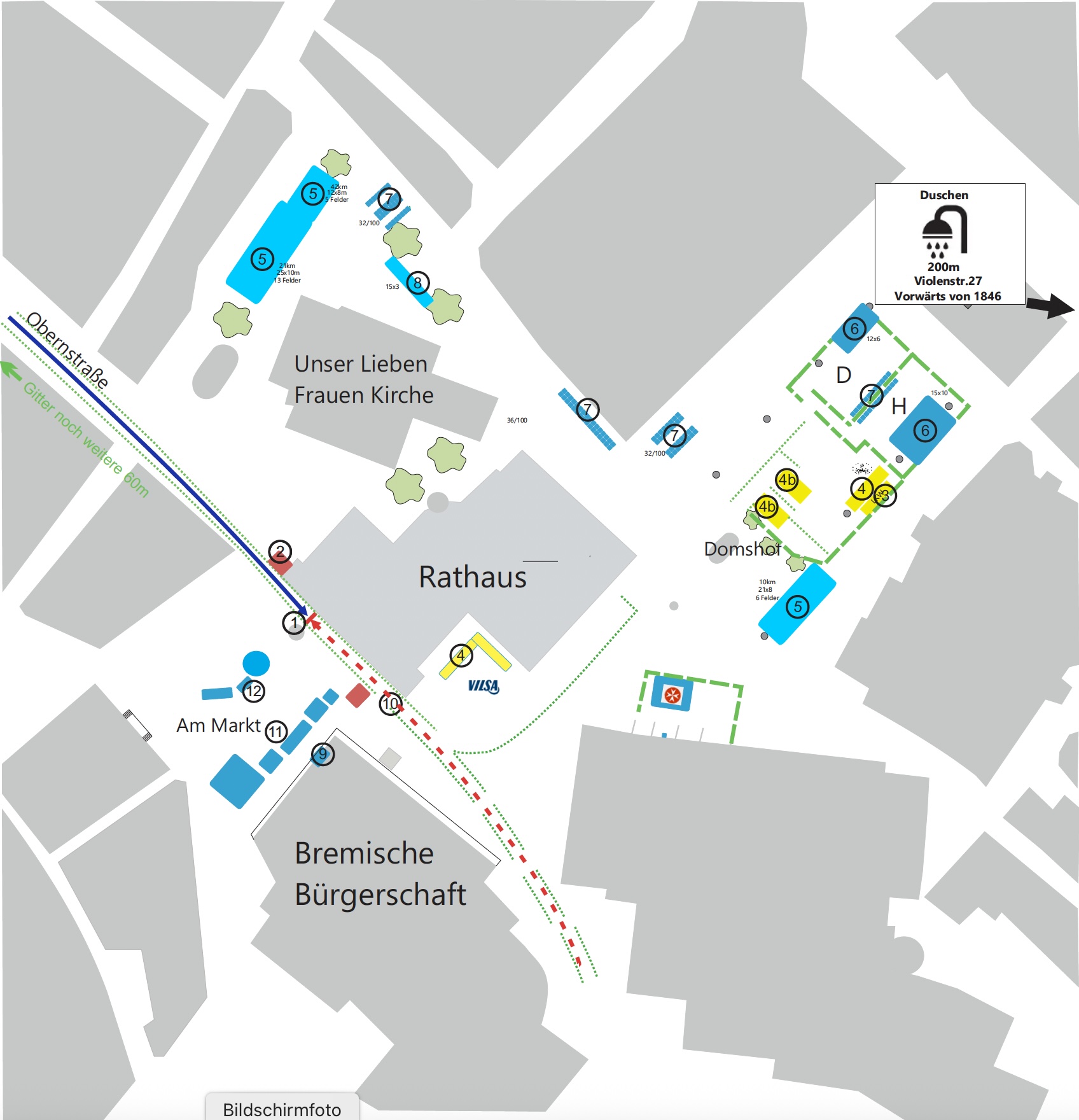 Das Eventgelände mit Start & Ziel und den Umkleiden befindet im Zentrum von Bremen direkt auf dem Marktplatz und Domshof. Das könnt ihr ganz einfach mit der Straßenbahnlinie 4, 6 und 8 oder dem Bus 24 und 25 bis zur Haltestelle Schüsselkorb erreichen. Von hier sind es nur noch wenige Schritte.